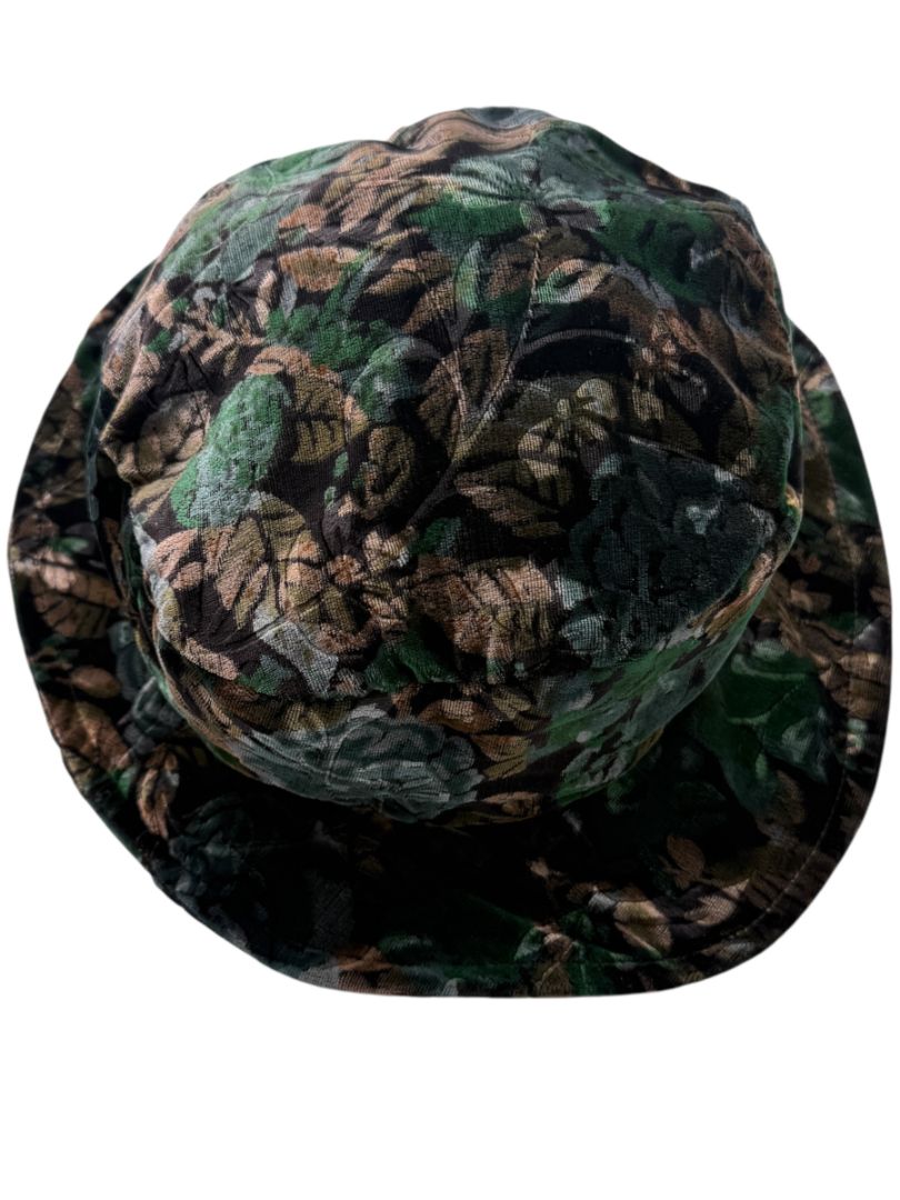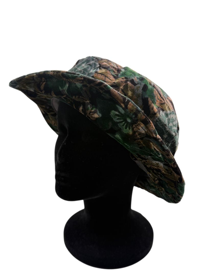 This distinctive multicolor velvet wire-brimmed hat showcases artistic craftsmanship and versatile design with a refined, vintage-inspired sensibility. Crafted from richly textured velvet, the hat features an intricate floral pattern in deep green, brown, and muted gold tones, creating depth and visual interest with a softly luminous finish.