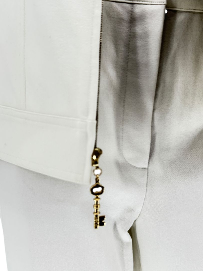 The jacket features a clean, tailored silhouette with a stand collar, full front zipper, and decorative gold chain embellishments with key and medallion charms at the chest pockets and hem—adding a bold, jewelry-like accent. Subtle seaming throughout creates a flattering, sculpted shape while maintaining comfort and flexibility thanks to the stretch denim construction.