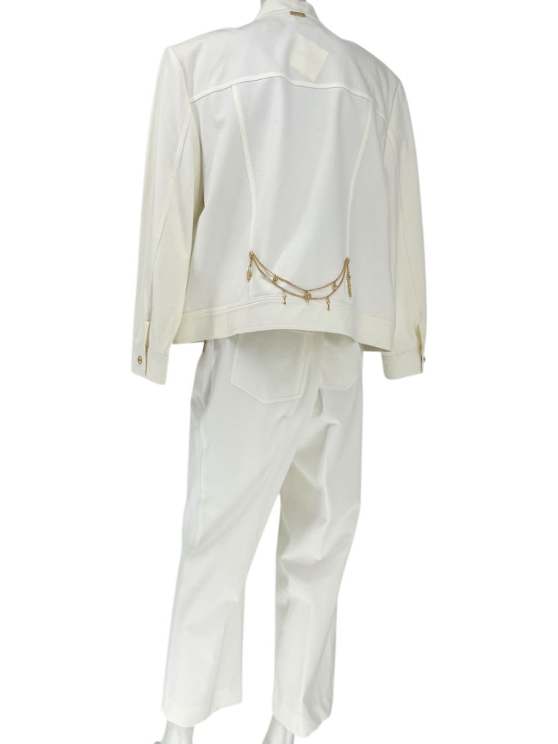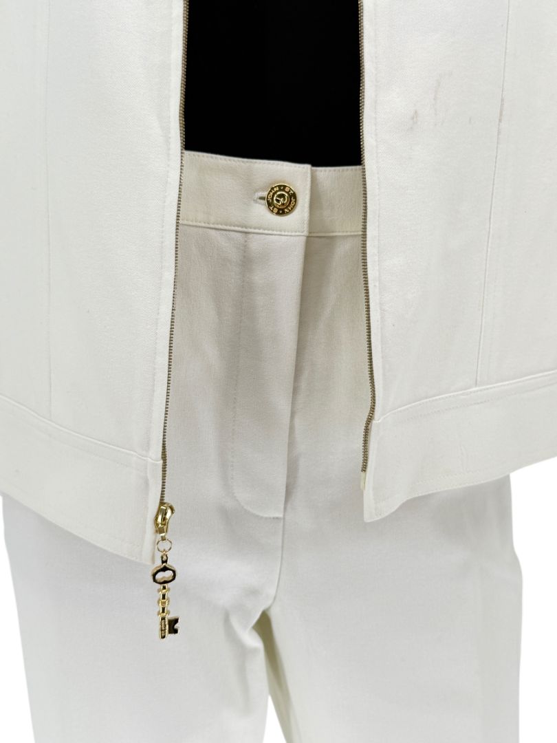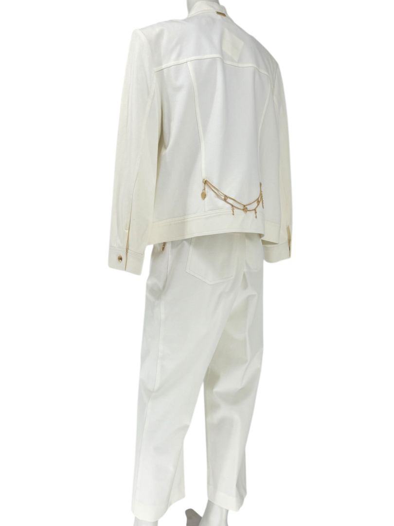 This striking Escada two-piece suit reimagines classic denim styling in a refined, couture-ready stretch fabrication. Rendered in crisp white, the set includes a structured zip-front jacket and coordinating straight-leg pants, both elevated with luxe gold-tone hardware and signature Escada detailing.